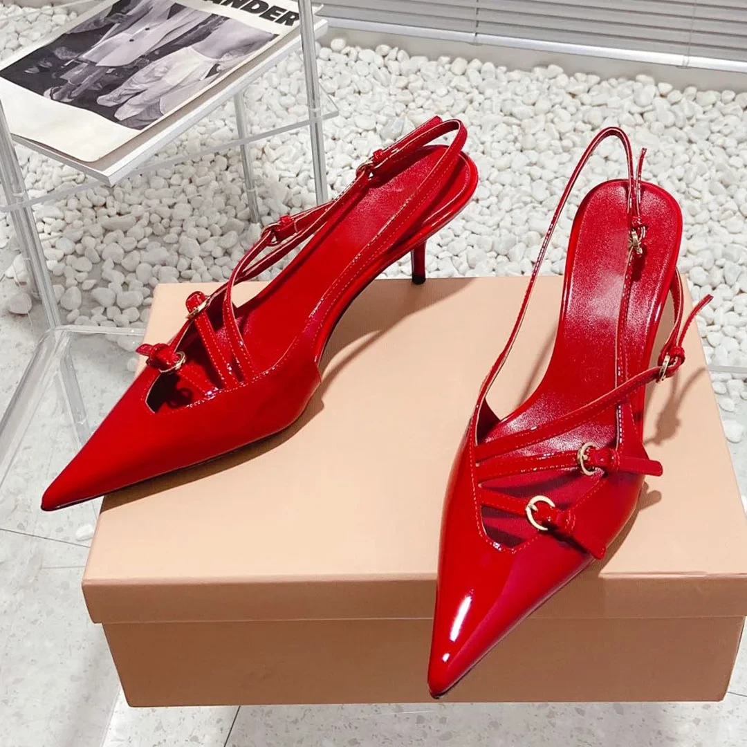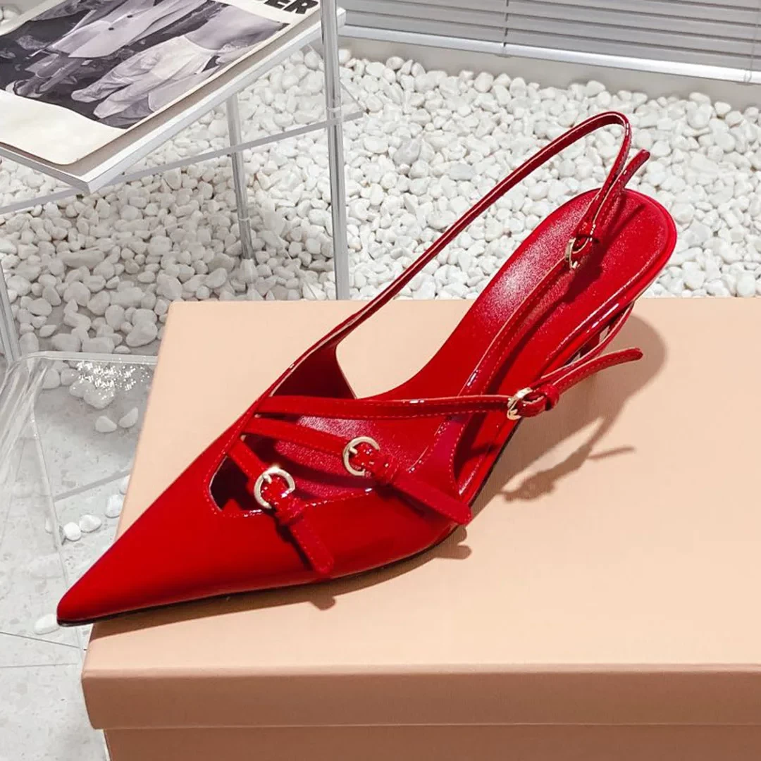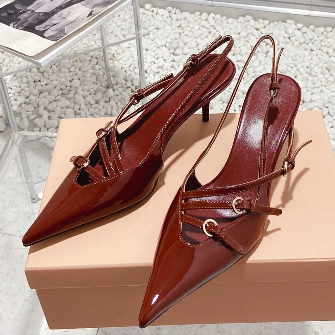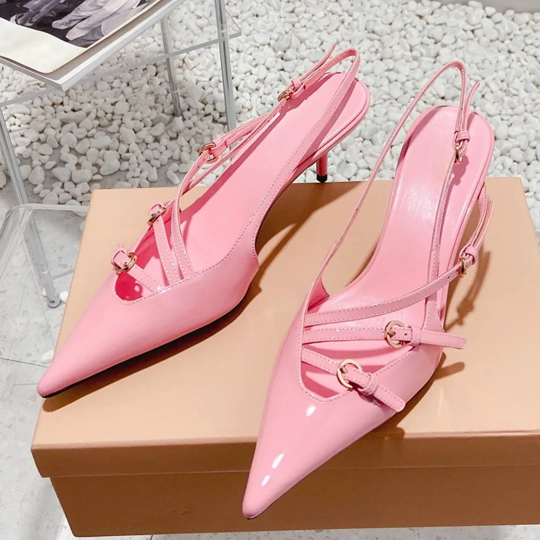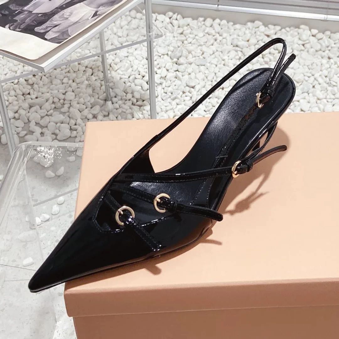 2023 Newest Spring Summer Kitten Heel Sandals Genuine Leather Women Shoes Solid Color Pointed Toe Buckle Decor Trendy Elegant