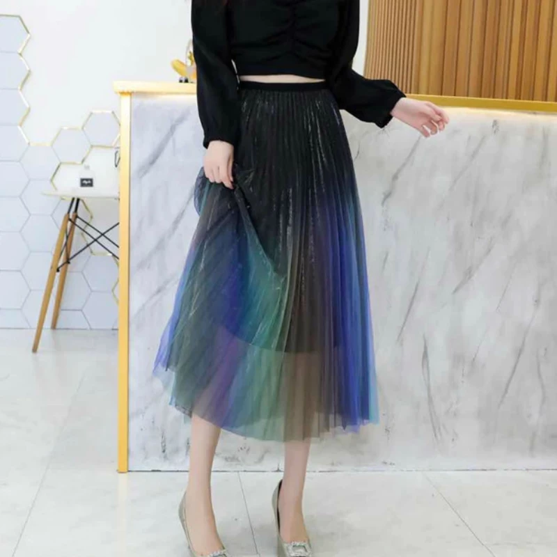Autumn Rainbow Colorful Metallic Maxi Long Tulle Skirts Gradient Shine Mesh A-line Pleated Ankle Long Skirts