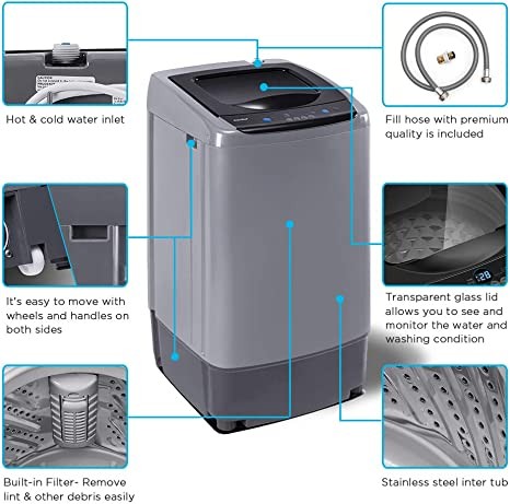 This top load compact washing machine with only 18.1 inches in width, 17.7 inches in-depth, and 31.5 inches in height, this portable washer is able to be stored easily. You can store it in your cabinet, RV, dorm, or even bathtub! Even better, it comes with wheels and handles for easy movement. It is a perfect choice for small households with limited space and minimal optimal.
