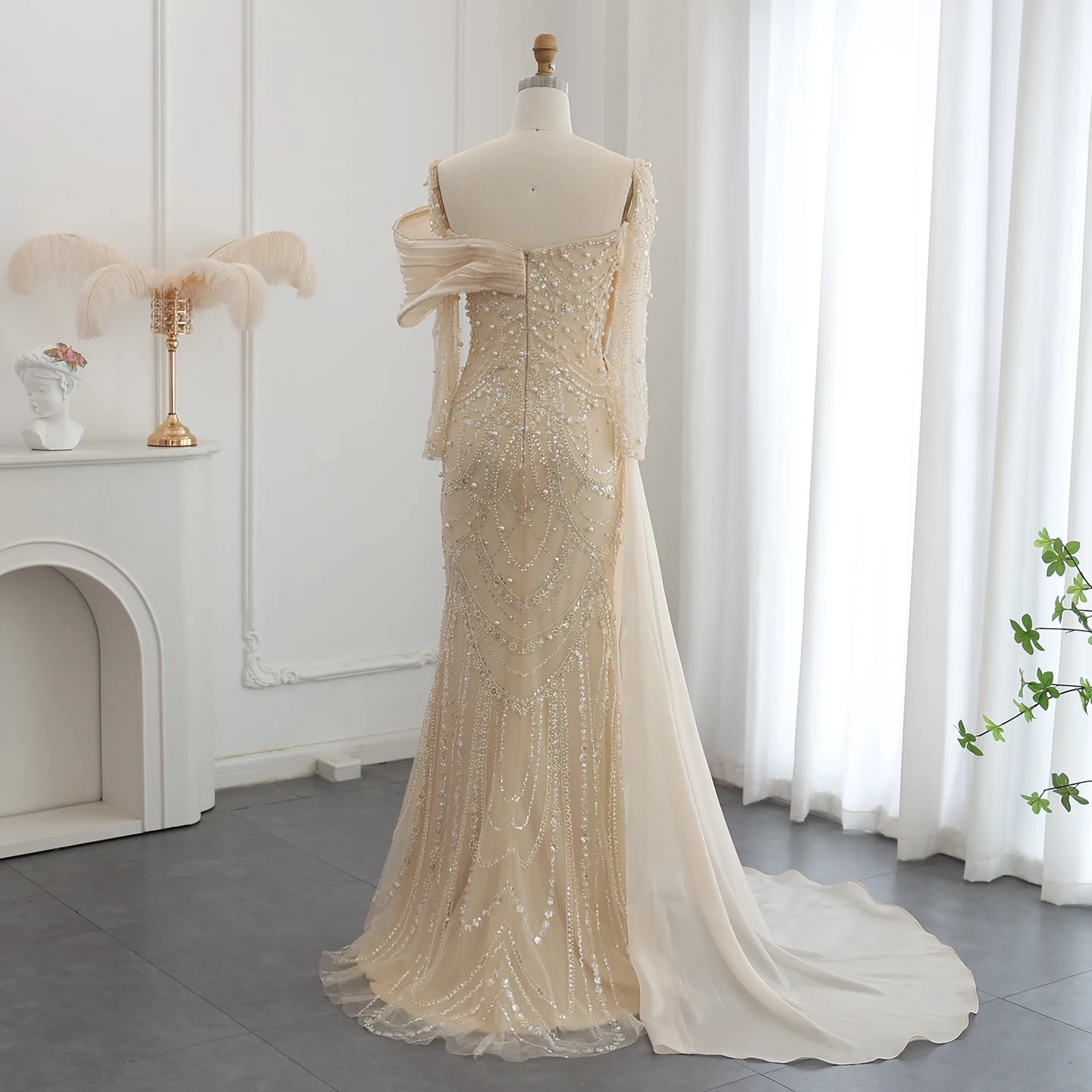 Sharon Said Custom Made Nude Crystal Mermaid Evening Dresses with Overskirt Long Sleeves Arabic Wedding Formal Prom Gowns SS256