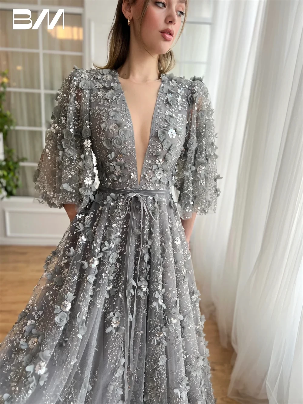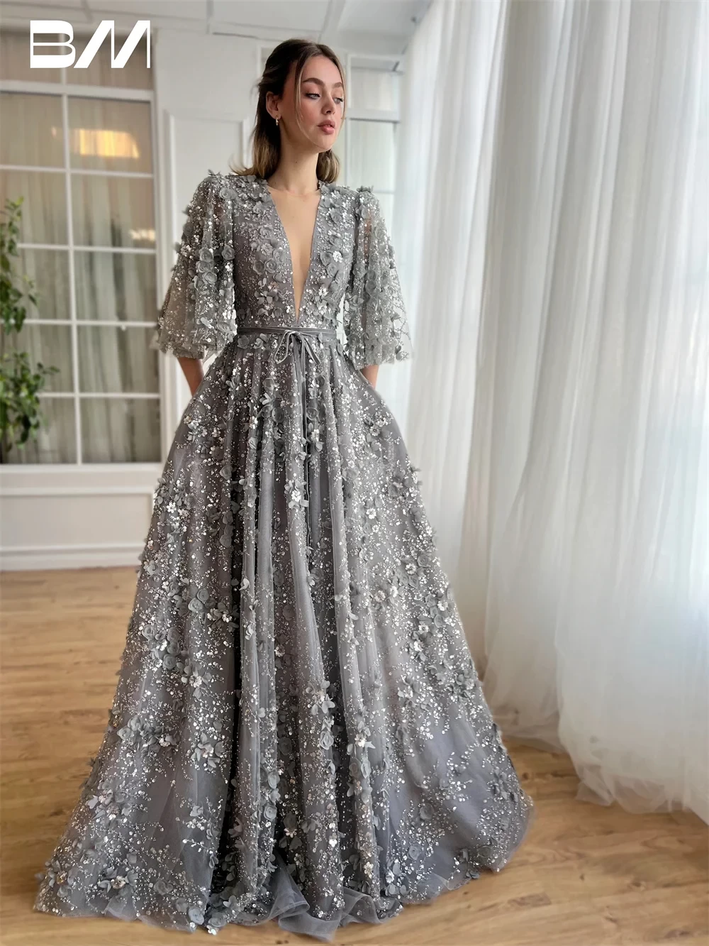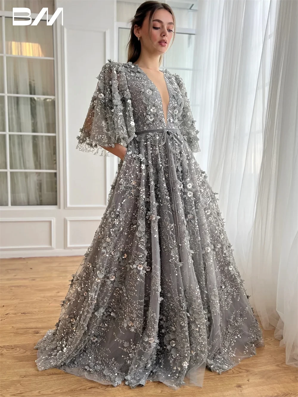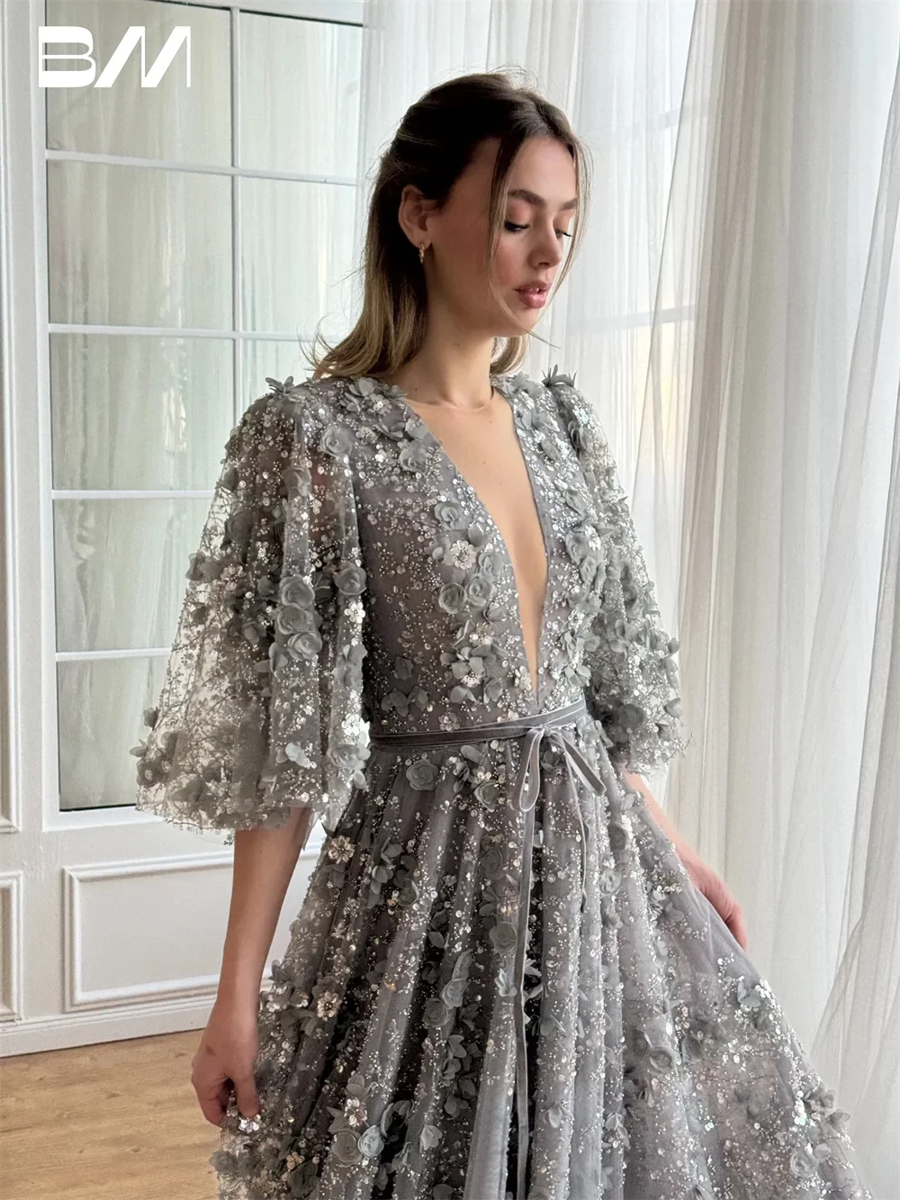 Sparkly Half Sleeve Sequins Prom Dress Pastrol 3D Flower A-line Cocktail Party Gown Romantic Vestidos De Novia